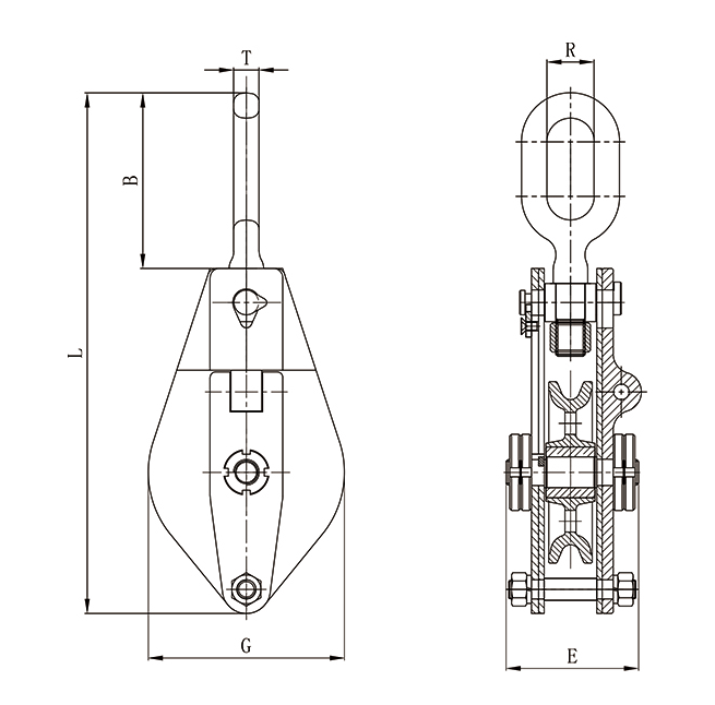 1、滑轮,采用精致铸钢轮,较之铸铁轮更加安全耐用。 2、合页,优质低碳合金钢锻造而成。并经过科学热处理,进而得到较高的综合强度和耐用度。 3、吊钩,经过精心设计,采用优质